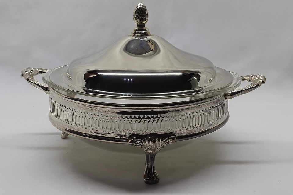 Very nice silver plate server by Sheridan in excellent condition. No evidence of damage, but does have some wear associated with use, mainly confined to a few light scratch/scuff marks (see photos). Measures 9" in diameter and includes a Pyrex casserole dish.
