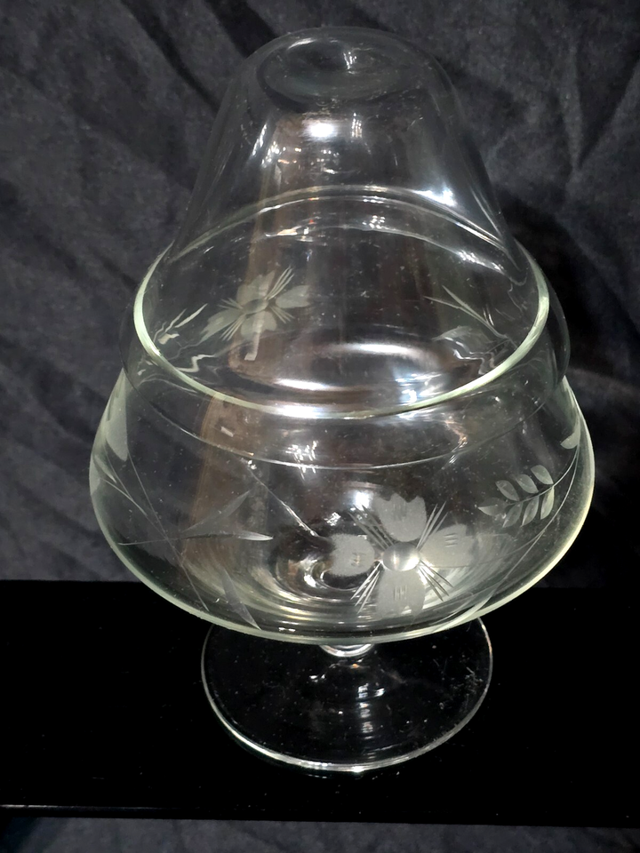 with light to normal use. Unknown maker, but the blanks were probably made by Libbey Glass, and etching done by Cataract Sharpe. Measures 7" tall to the top of the dome/insert and looks to have a capacity of about 10 ounces.