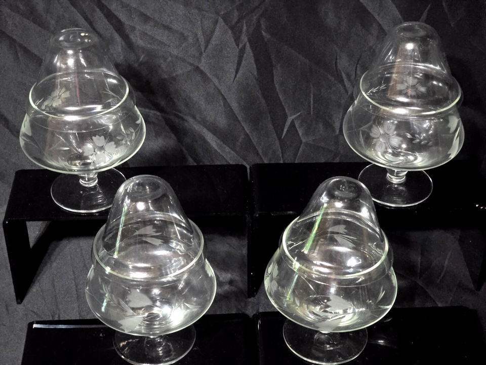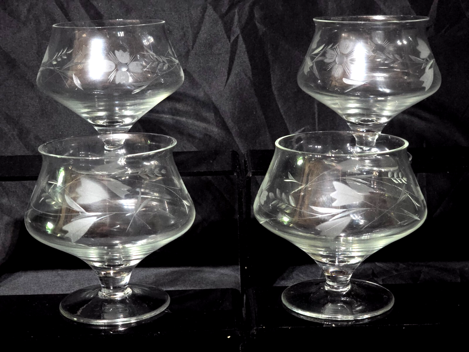 Nice set of 4 etched floral shrimp/seafood cocktail glasses with inserts in excellent condition. Great clarity, no