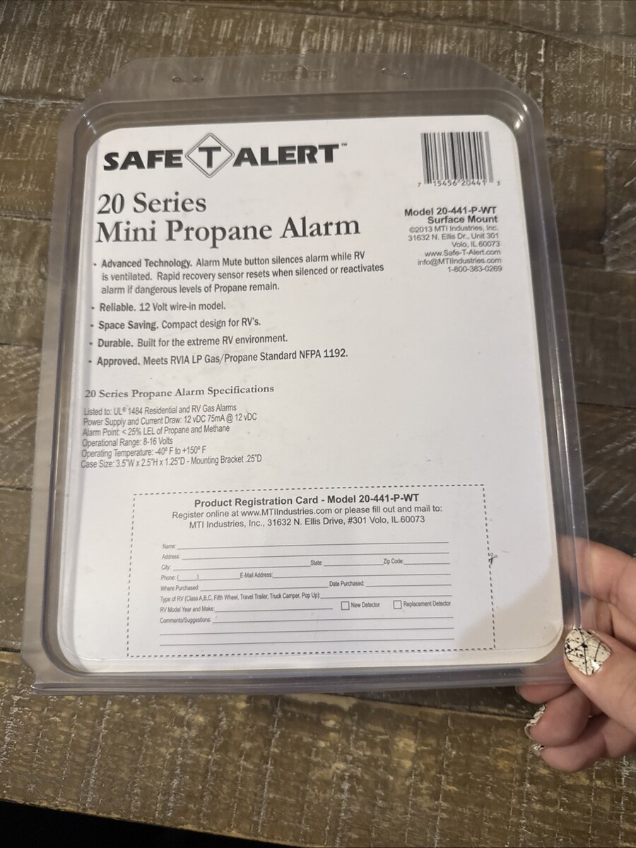 The Safe-T-Alert 20-441-P-WT is a propane gas detector alarm manufactured by MTI Industries Inc. It is designed for travel trailers, folding campers, RVs, and other recreational vehicles. This unit operates on a 12v hardwire power source and has an operational temperature range of -31 F to +150 F. Made in the United States, this leak detector is a crucial safety component for detecting potential gas leaks while on the road or at sea.