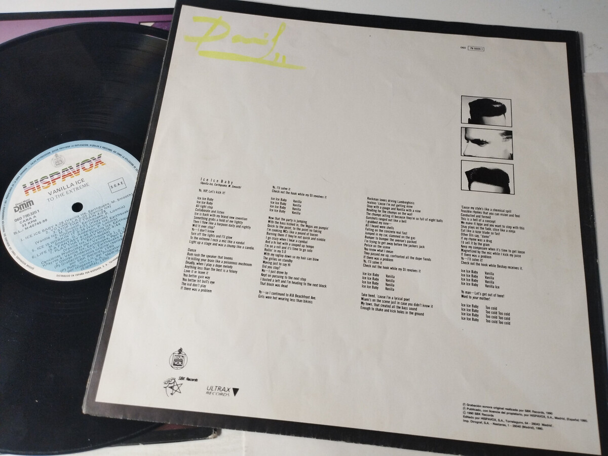 vanilla ice, to the extreme, lp 1990, original vinyl , ice ice baby, hispavox, sbk records, ultrax records, 90s rap, vintage hip hop, old school, urban music, dmm pressing, vinyl collection, rare spanish pressing, classic vinyls, edited spanish rap, spanish edition, 33 rpm, maxi album, rare groove