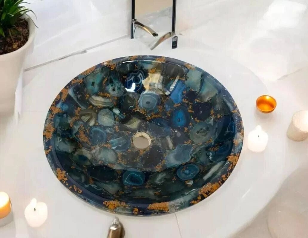 Blue Agate & Gold Resin Bathroom Sink | Luxury Gemstone Vessel Basin | Handmade