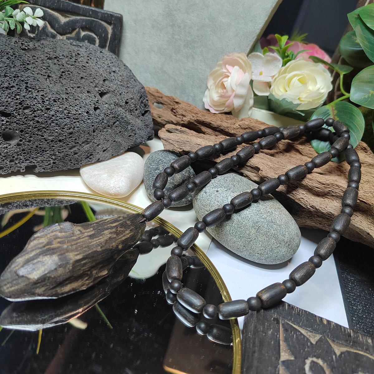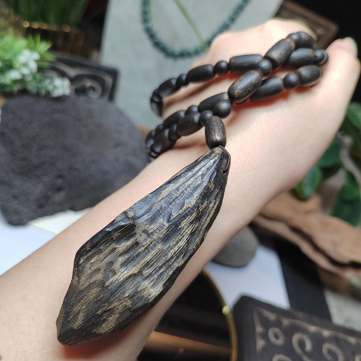 This exquisite necklace is hand-assembled from cultivated agarwood matured for 10?15 years before carving. It features smooth barrel beads and fine round spacers paired with a bold sculpted pendant?blending timeless tradition with modern style. Each piece reveals natural resin grain patterns, making every necklace uniquely one-of-a-kind.