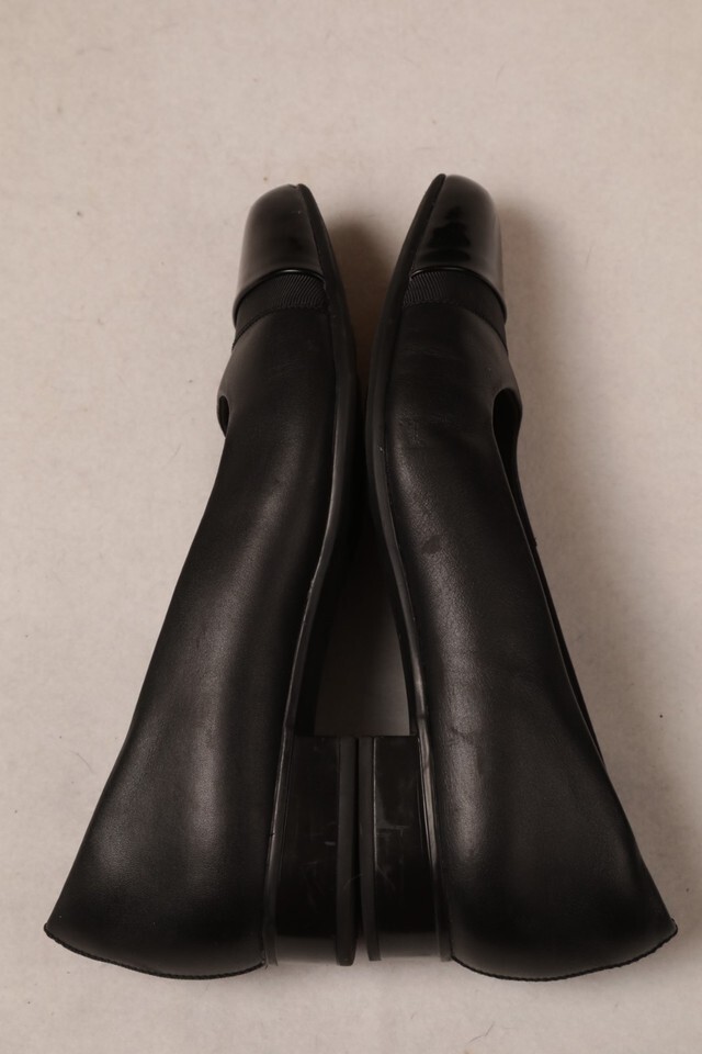 Description: Women's Classic Pumps shoes. Slip on style. Shiny cap exterior heel- color all black, separated by a fabric twill ribbon- front of shoe and back of shoe. This shoe is very similar to the style, "Keesha Rose", but I believe this shoe is a newer version.