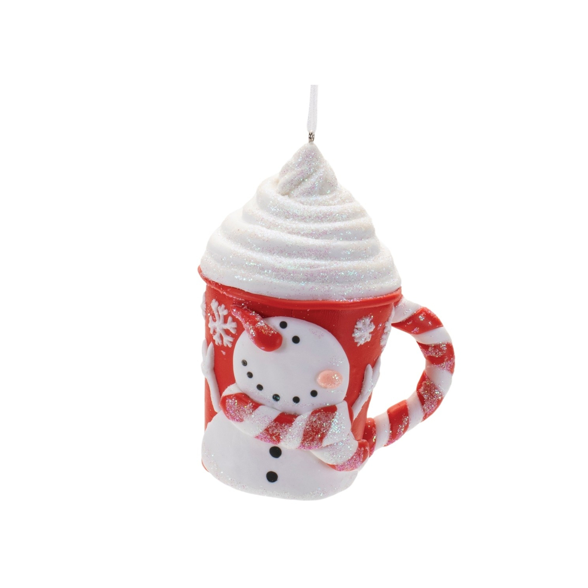 Bring festive charm to your tree with the Peppermint Snowman Mug Ornament. Featuring a whimsical snowman design on a cozy coffee mug, this ornament is decorated with peppermint stripes and topped with a delightful whipped cream accent. Finished in festive red and white tones with a touch of glitter for added sparkle, this ornament adds a playful and warm touch to your holiday decor. Sold in a set of 12 matching pieces, it s perfect for your peppermint-themed display or as a gift to spread holiday cheer.