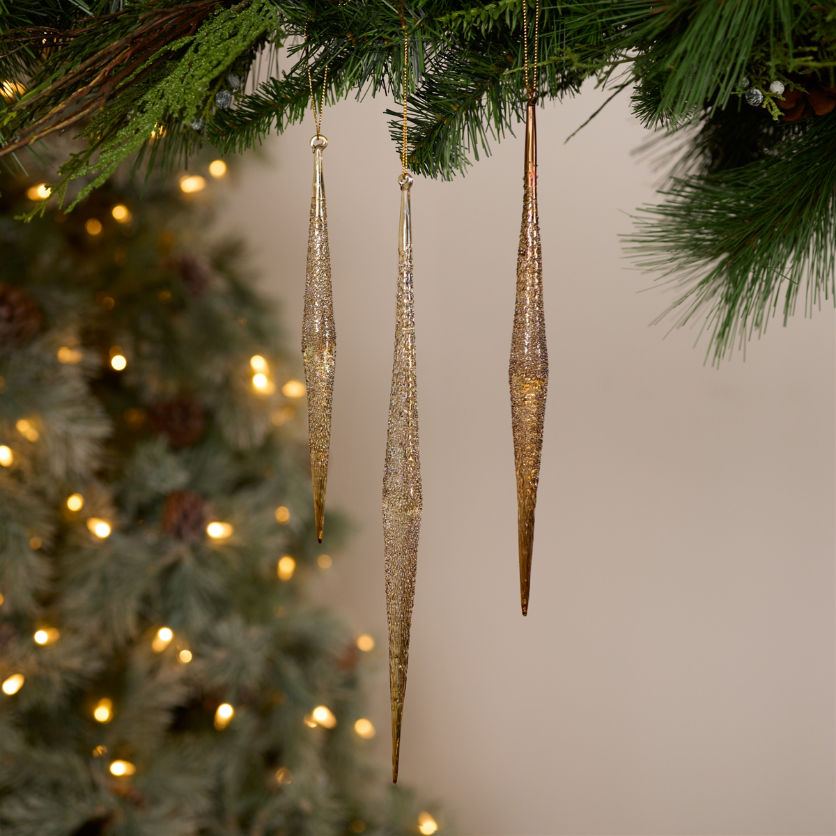 Add a touch of elegance to your holiday decor with the Gold and Silver Ombre Icicle Ornaments Set. This stunning collection includes beautiful glass ornaments in three different sizes (9.75"H, 11.75"H, 13.25"H). Featuring a chic ombre finish that transitions from gold to silver, these ornaments bring a modern, sophisticated flair to any Christmas tree. Whether you re decorating for your home or adding a festive touch to a commercial space, these icicle ornaments are designed to make a lasting impression. Easy to hang and perfect for gifting, they ll add timeless beauty to your holidays for years to come. Sold in a set of six pieces with three assorted sizes to create a balanced and versatile display on your Christmas tree.