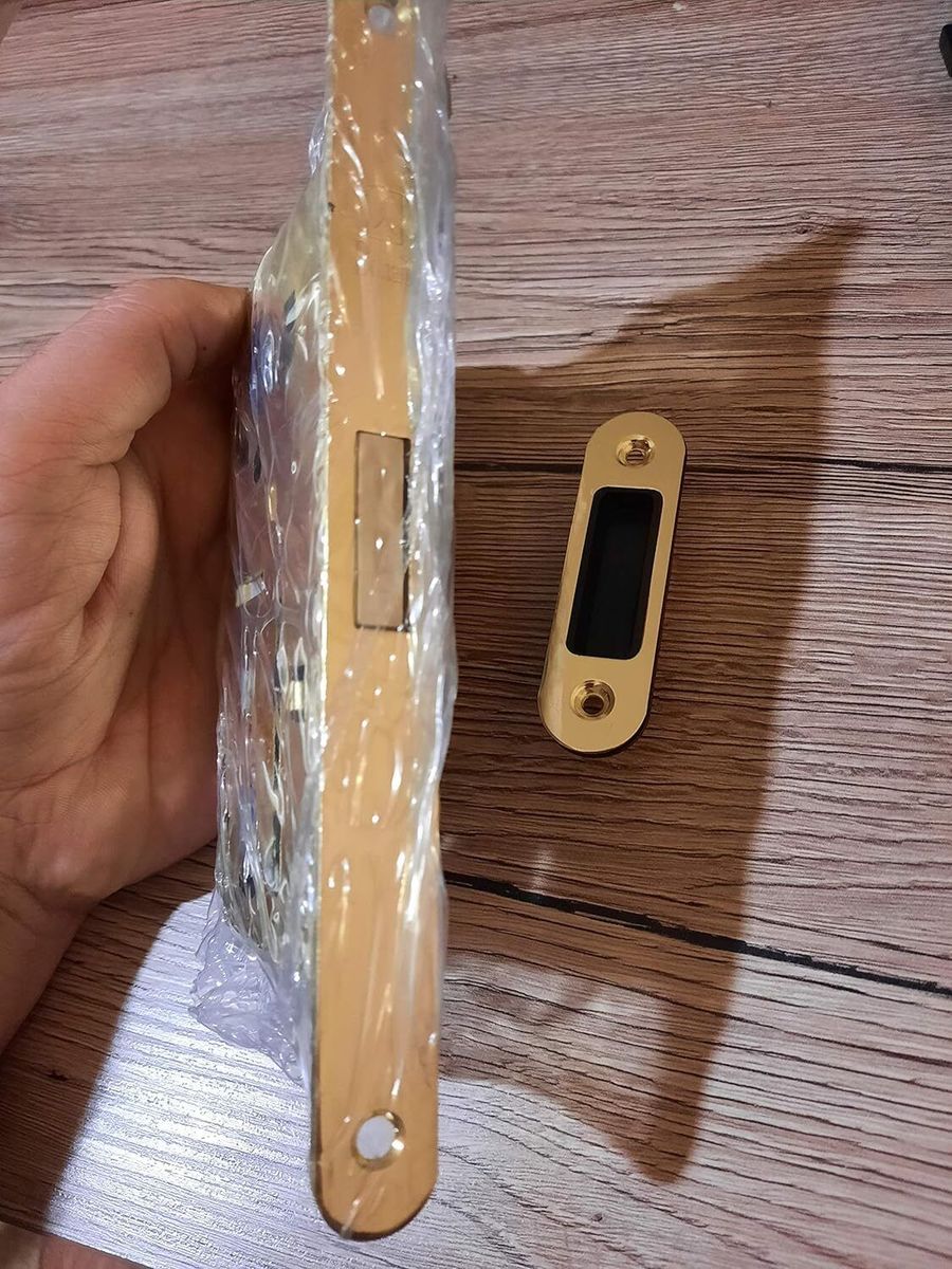 The first magnetic lock with latch positioned at the center of the front plate permitting the reversibility of the door.
