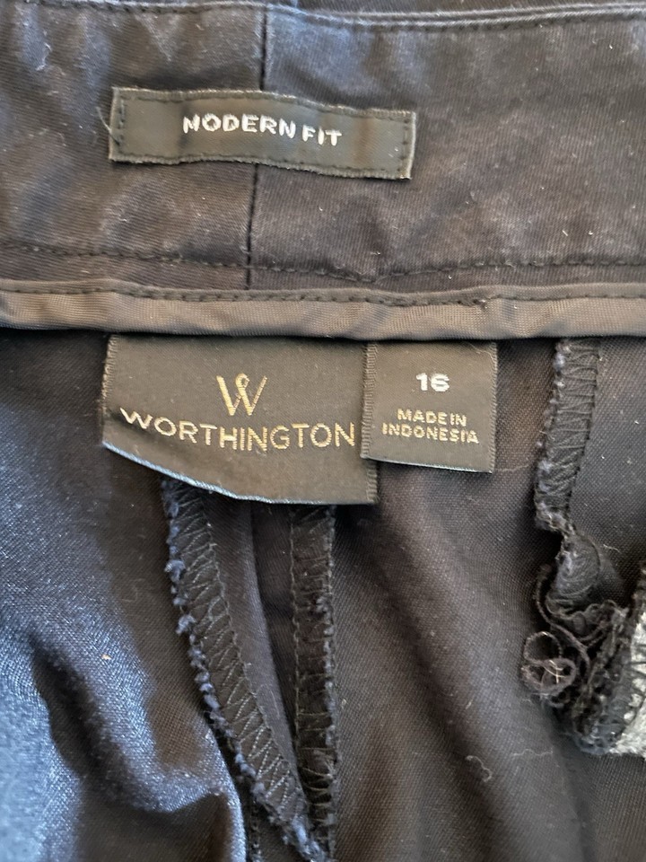 The product is a pair of black Worthington capris in size 16, designed for women. These modern fit capris are made by Worthington Industries and feature a sleek style perfect for everyday wear. The regular size type ensures a comfortable and flattering fit, making them a versatile addition to any woman's wardrobe.
