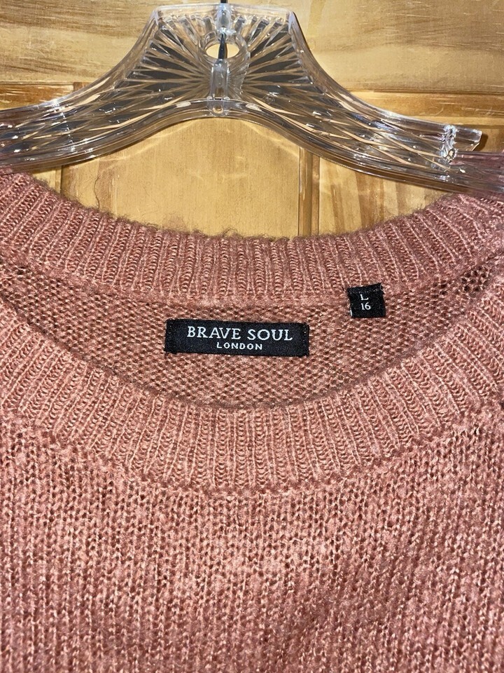 This is a cozy pink pullover sweater from the brand Brave Soul, designed for women in size Large. The sweater features a London theme and is categorized under Women's Clothing.
