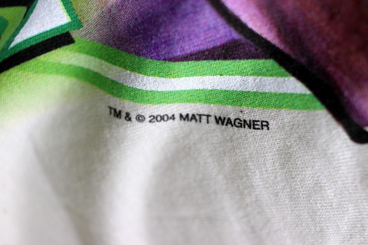 The VTG NOS 2004 Matt Wagner MAGE Comic Graphic Graphitti T Shirt is a vintage reprint of a graphic tee featuring characters from the MAGE comic series by Matt Wagner. This multicolor shirt is designed by Graphitti Designs and is a classic piece of unisex adult clothing with a regular fit and short sleeves. Available in multiple sizes, this t-shirt is a must-have for any comic book fan looking to add a unique and eye-catching piece to their wardrobe.