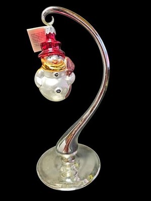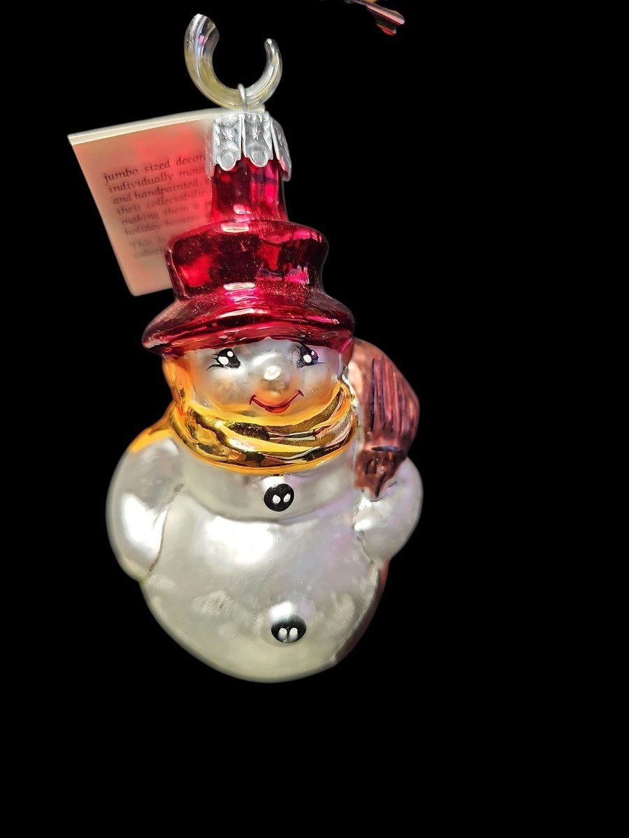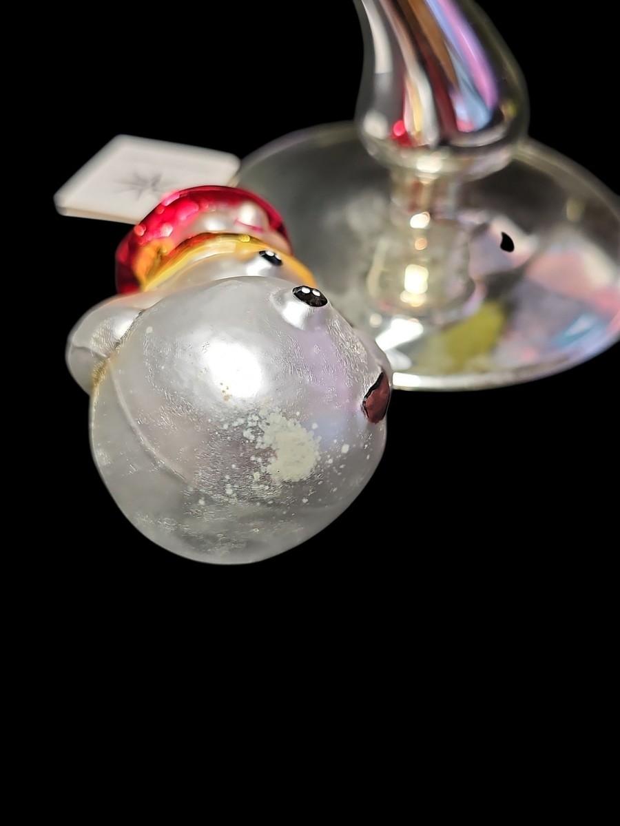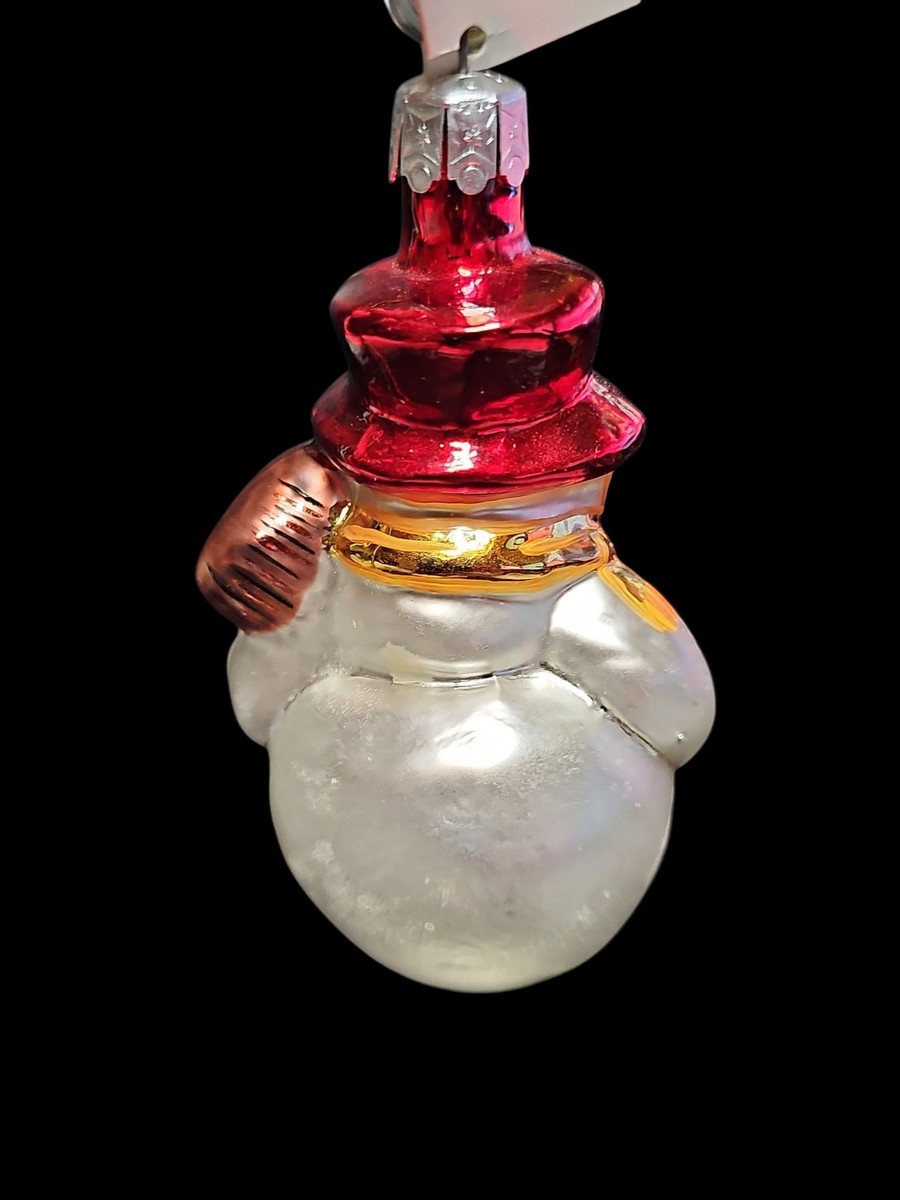 Tiny hand-painted glass snowman ornament with scarf and top hat. Part of Radko?s Littles series. Mouth-blown in Poland. Retired. Approx. 3" tall. Original hang tag included, no box.