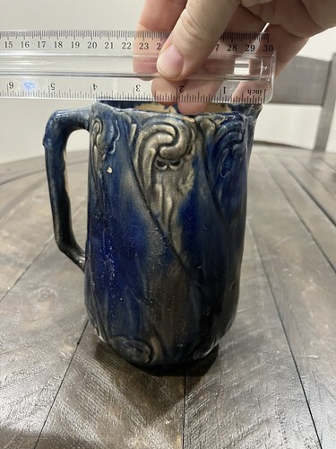 Antique English Majolica Cobalt Blue Floral Design Handle Pitcher
