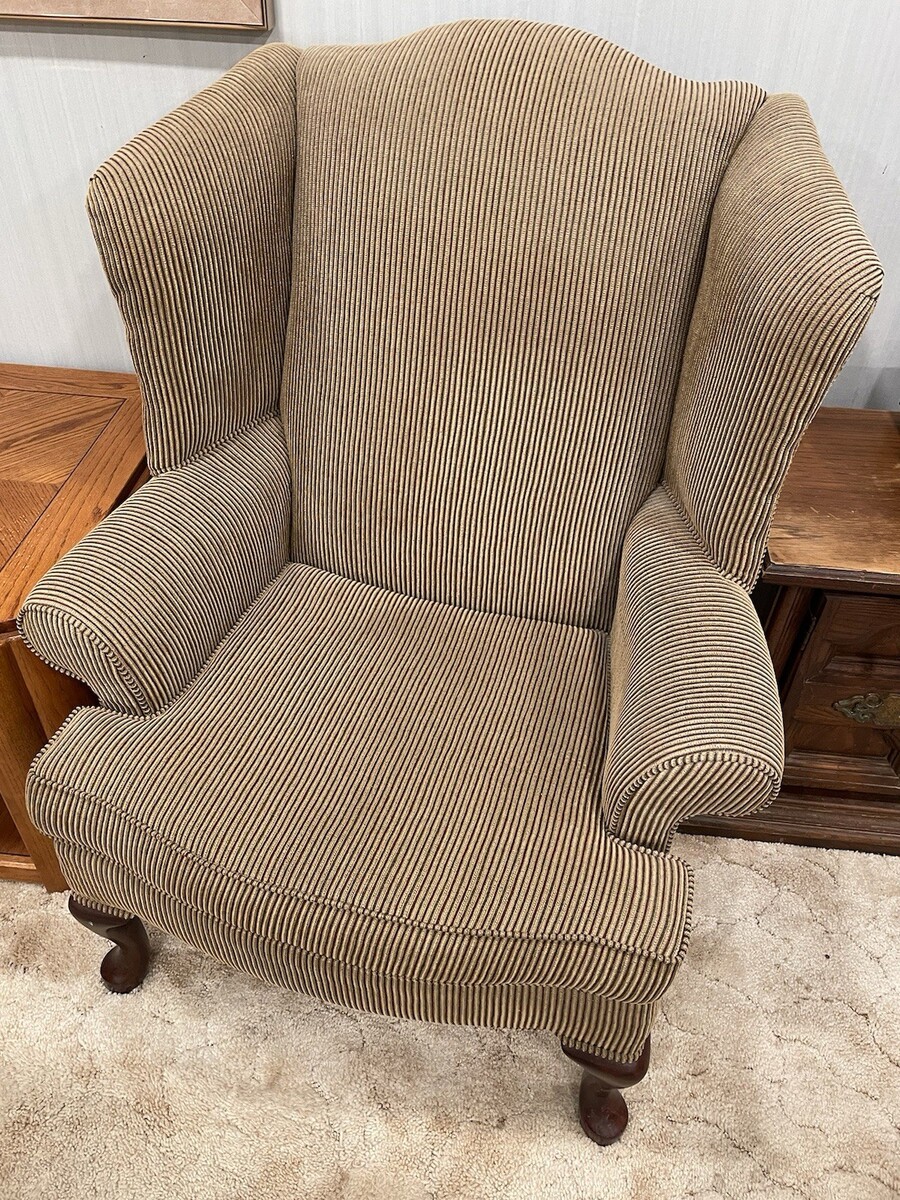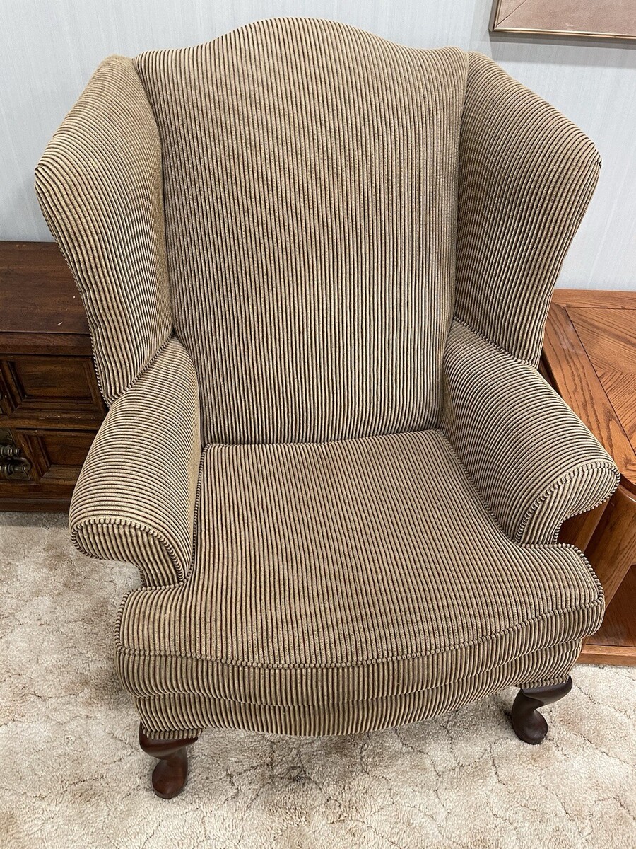 For sale is a set of 2 matching wood and brown fabric wing back armchairs. The chairs have very little wear. Very solid and comfortable construction.