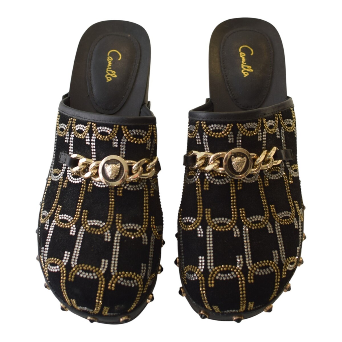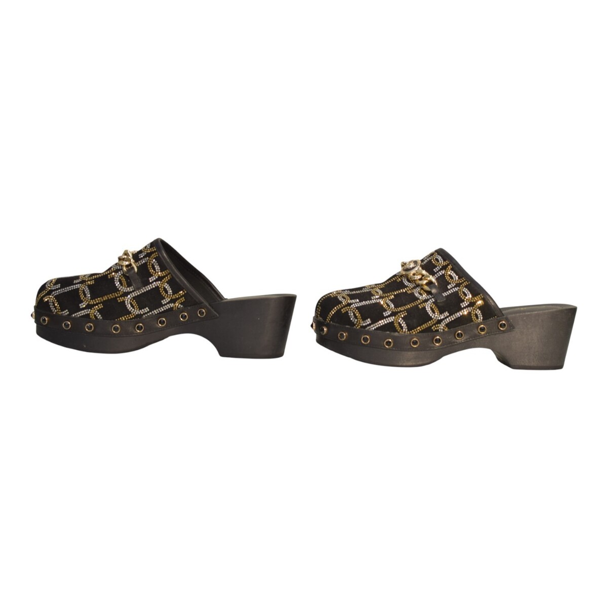 Camilla Arabella Leopard chain black embellisehd in gold & silver clogs sz.40