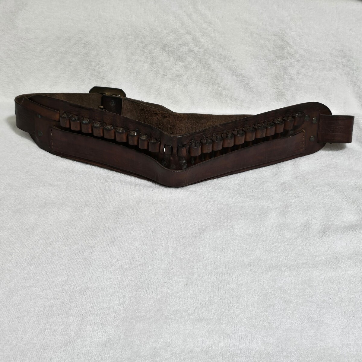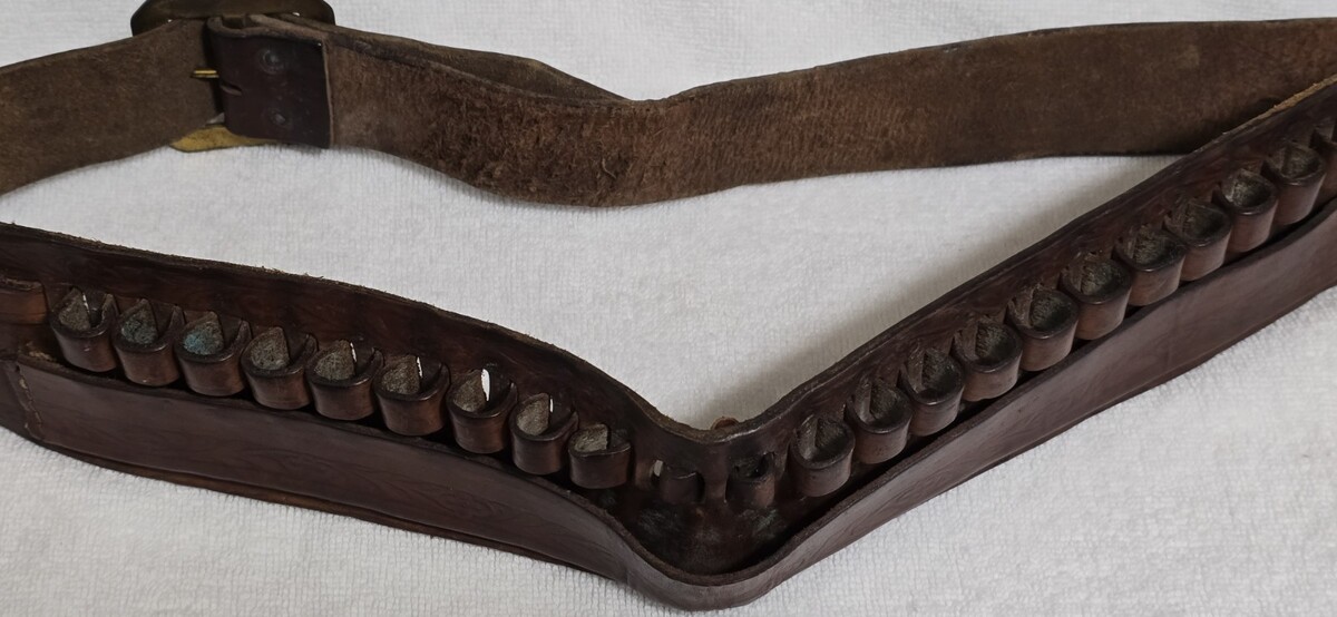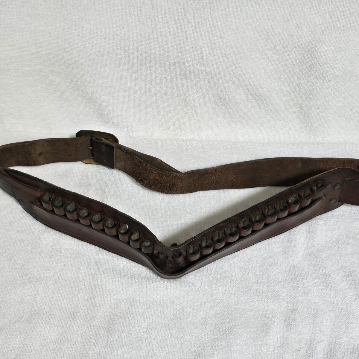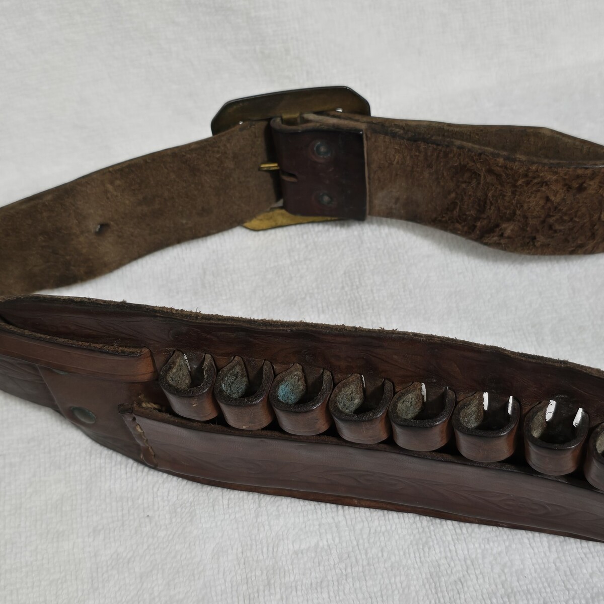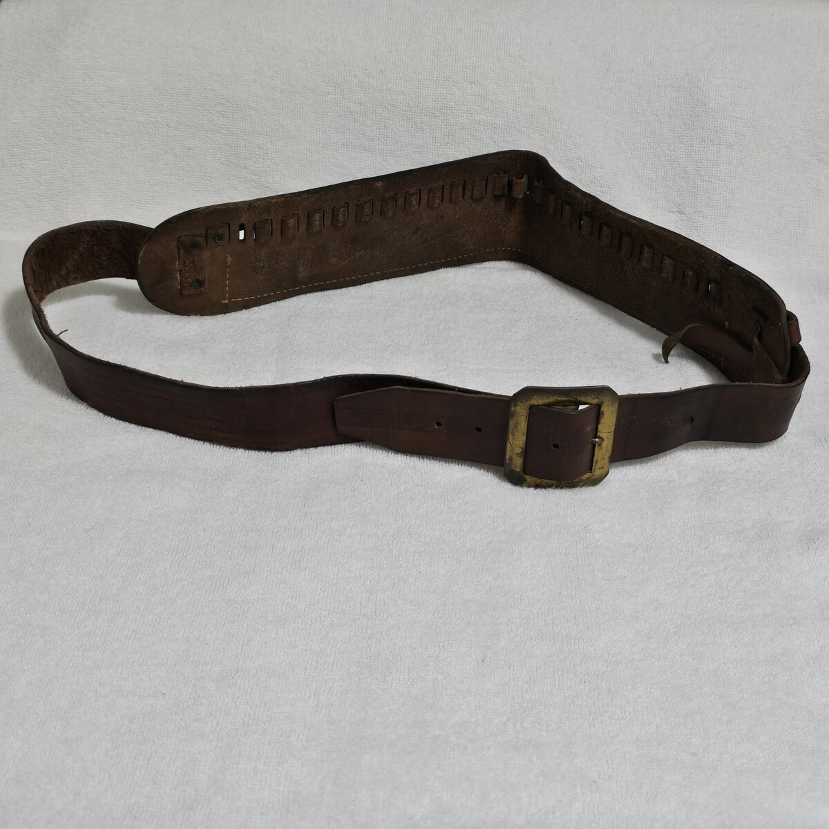 ***Very good vintage condition. Brass buckle shows patina and wear from age. Leather shows normal use and age patina throughout. Some cartridge loops show light verdigris. Leather remains strong and pliable. Please see photos.***
