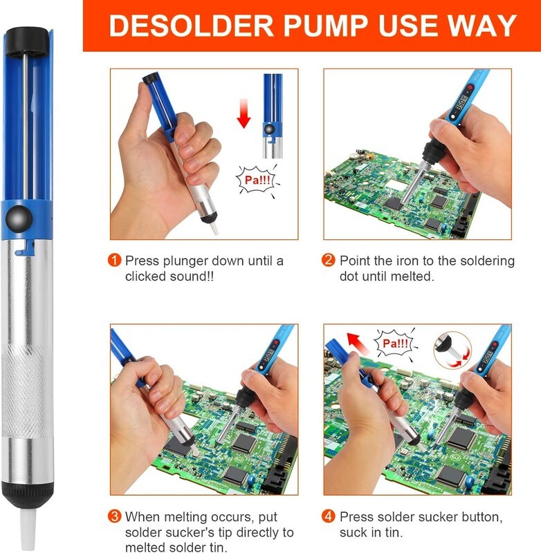 [Solder Sucker Desoldering Pump]: Rugged metal construction,the desoldering pump is high pressure vacuum tube with aluminum body frame, which allows easy one-handed use, best for removing solder from PCB through hole solder joints.