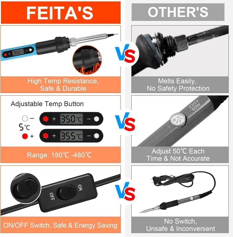 [Precise Temp Switch Control]: With high definition LCD digital screen of the large temp range (180?-480?), adjust "+/-" buttons to adjust +/-5? temperature. Humanized ON/OFF switch of the soldering iron makes it more convenient to to save energy and ensure safe welding.
