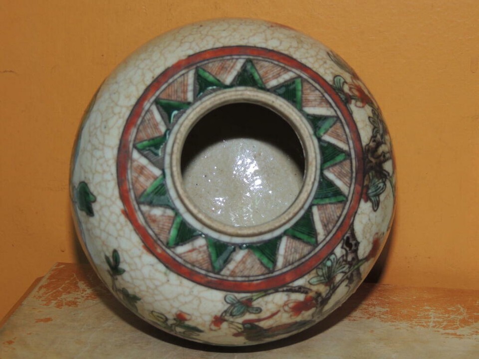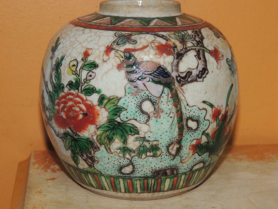 Chinese 4.75" Ginger Jar bird pomegranate tree Antique famille verte Qing Ming