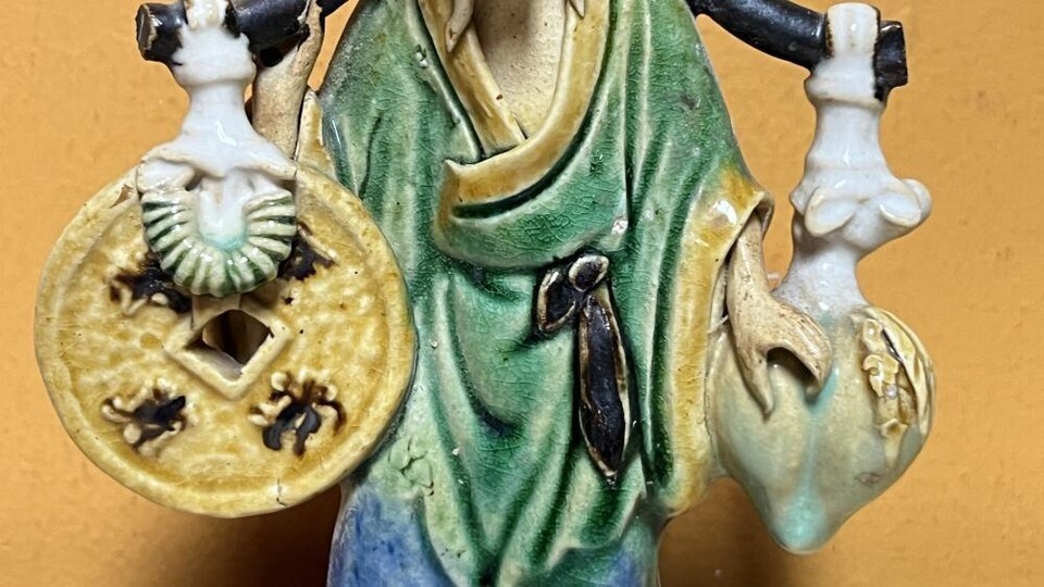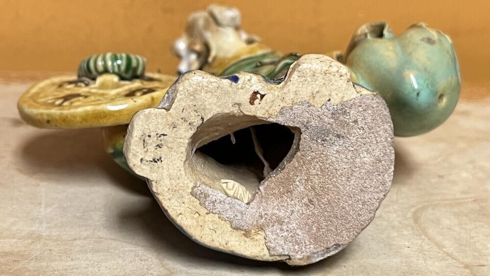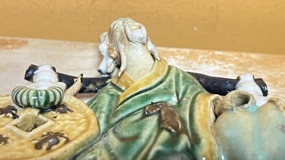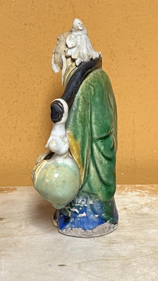 Chinese Mud Man Men 4.75" Yellow Blue Green yoke fruit coin Mudman Antique c1910