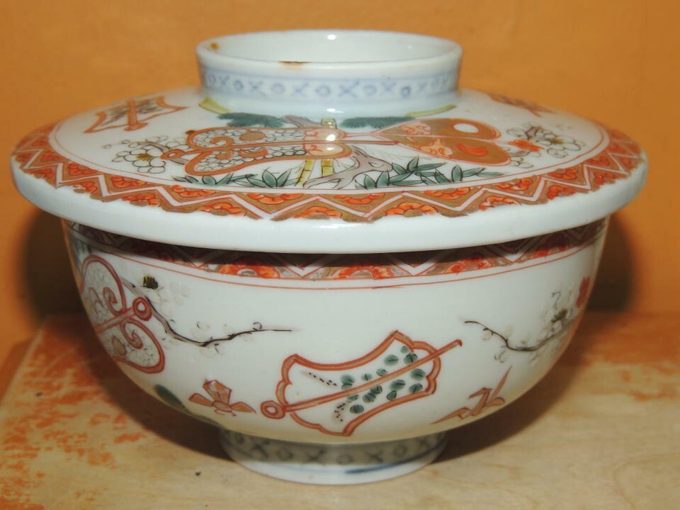 Chinese export ware Japanese Arita 5" Bowl w Lid Red Blue Green Meiji 19th earli