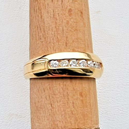 This product is a stunning 14K yellow gold men's wedding band ring featuring 7 natural round diamonds in a channel-set style. The main stone color is white/colorless, and the band style adds a sleek and modern touch to this piece of fine jewelry. This ring is perfect for a wedding occasion and is crafted with high-quality gemstones and materials, making it a timeless and elegant choice for any bridegroom looking to add a touch of luxury to his special day.