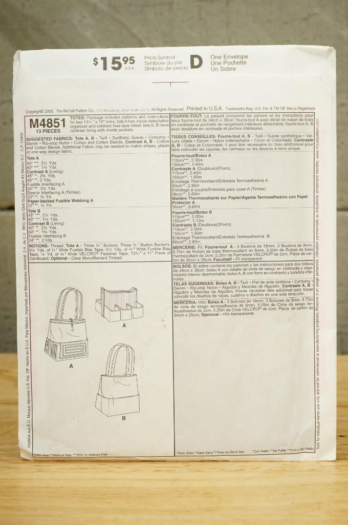 M4851 McCalls Fashion Accessories Sewing with Nancy Pattern Tote Bag Purses. Pattern is crisp and uncut. No smoke or pet odors.
