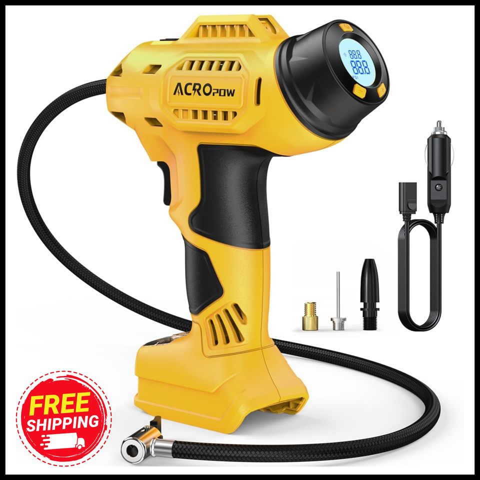 ?MULTIPLE PURPOSE?EASY TO USE? This handheld cordless air compressor with Bicycle valve adapter, ball needle adapter, tapered adapter is applicable for Automotive, SUVs, cars, motors, bicycles, and basketball-size inflatable products. You'll have complete control over your tire pressure, and the battery powered tire inflator helps you maintain perfect levels for optimal performance and safety. Note: not suitable for large truck tires. The inflator works with Dewalt 20 V max battery platform