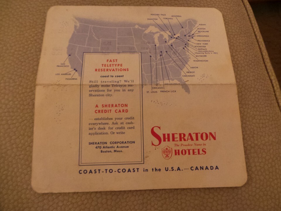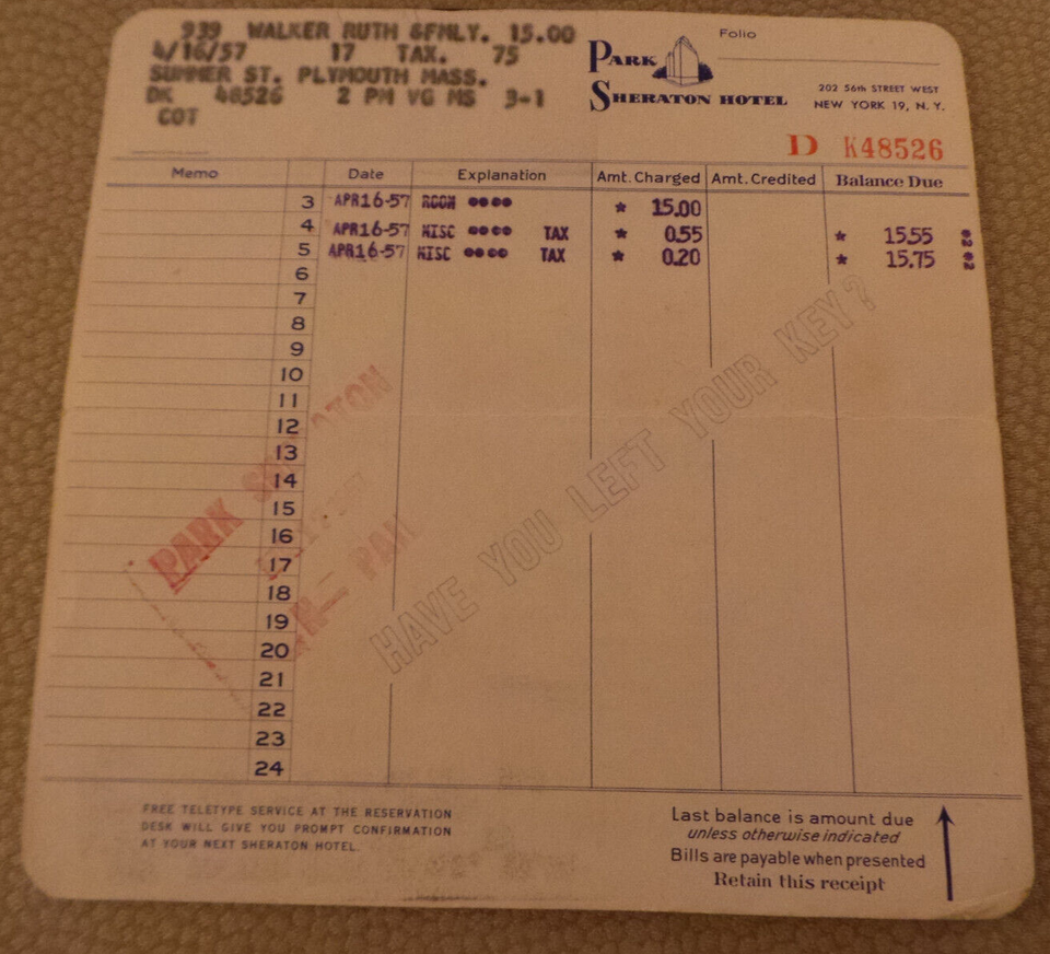 Vintage Park Sheraton, NY NY Hotel Bill April 1957. other side has US Map with hotel locations pinpointed