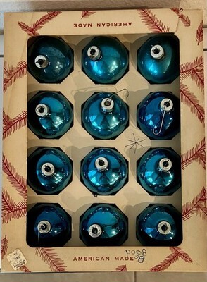 This Vintage Coby American-Made Mercury Glass With Ornaments Boxed Set of 12 from the 1960s is a charming addition to any Christmas decor collection. Made in the USA, these small round ornaments in a beautiful cobalt blue color feature a classic ball shape, perfect for celebrating the holiday season with a touch of nostalgia. The set includes 12 original ornaments, each featuring the brand's signature design and a vintage charm that harks back to a bygone era. Displaying a patriotic theme and a timeless appeal, these ornaments are a unique and special find for collectors of vintage holiday decor.