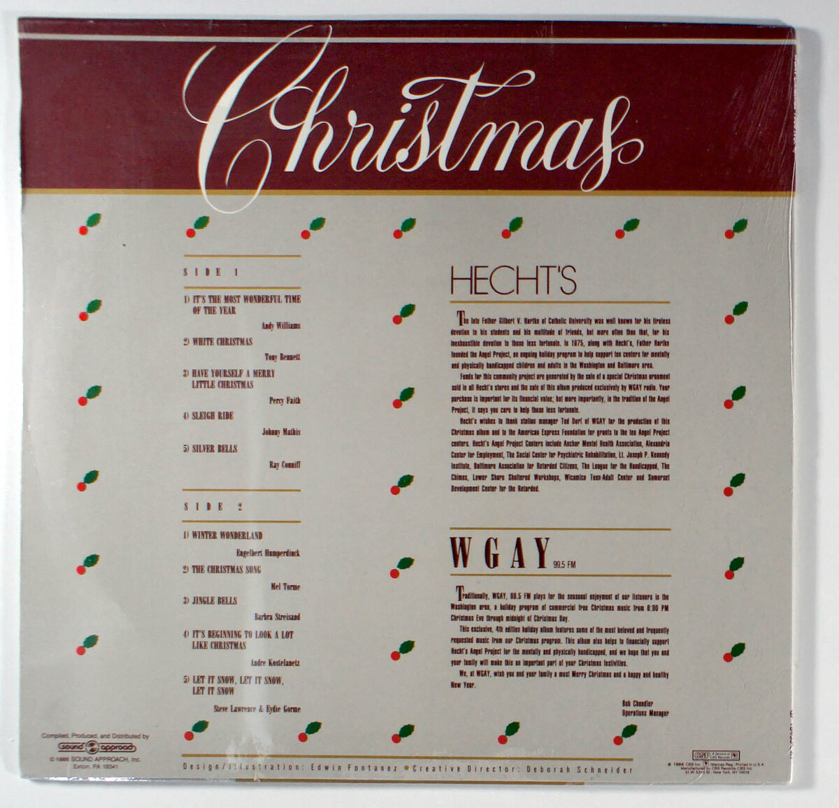 Christmas WGAY 99.5 FM Especially For You! released on the Sound Approach label, is a festive vinyl compilation featuring holiday classics performed by renowned artists like Andy Williams, Tony Bennett, and Barbra Streisand. Produced in collaboration with Hecht's department stores, The Angel Project, and WGAY 99.5 FM radio, the album was a charitable effort, reflecting the stations commitment to community service in the Washington, DC area. Notable tracks include Andy Williams Its The Most Wonderful Time Of The Year, Tony Bennetts White Christmas, and Barbra Streisands Jingle Bells, all of which were popular holiday standards but not charted as hit singles from this specific release. The albums historical significance lies in its role as a regional charity project, capturing the eras easy-listening holiday music trend and WGAYs influence as a prominent beautiful music station. No specific hit singles emerged directly from this compilation, as it primarily featured