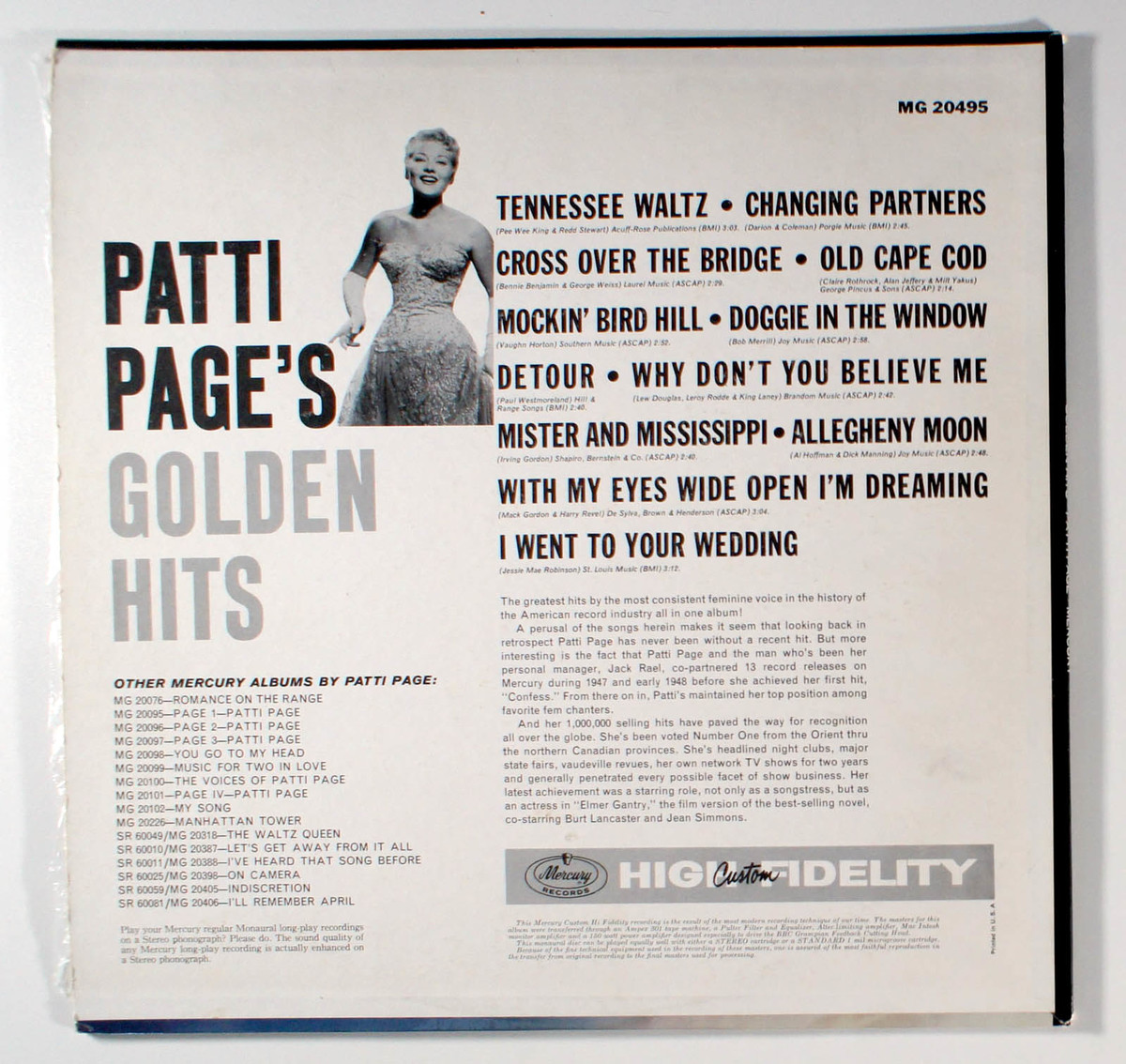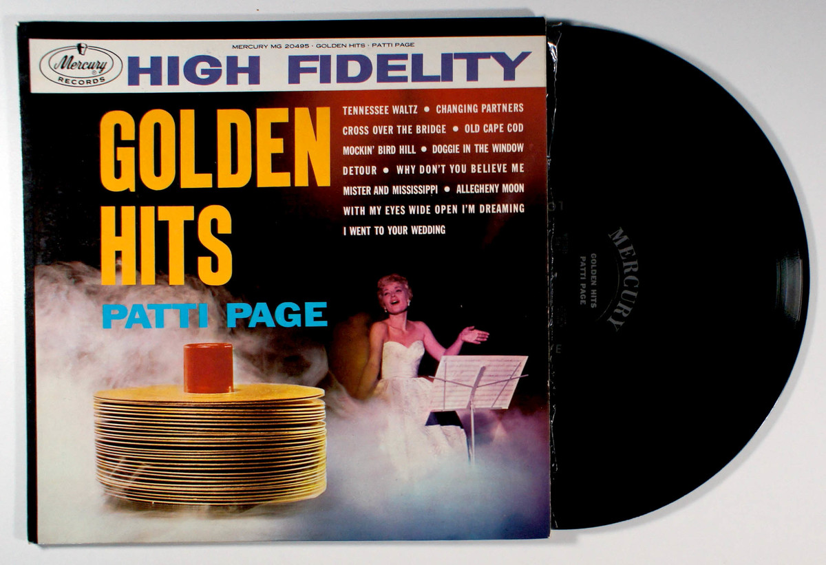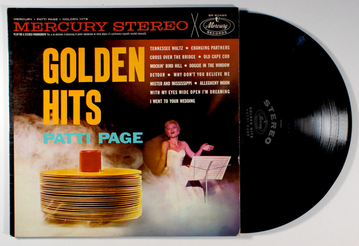 Golden Hits, by Patti Page, released in 1960 by Mercury Records, is a compilation showcasing her most popular songs from the late 1940s and 1950s, capturing her signature smooth vocal style and versatility in pop and country music. It includes hit singles like Tennessee Waltz, which became one of the best-selling songs of its era, reaching No. 1 on the Billboard charts in 1950 and selling millions of copies, cementing Pages status as a leading artist. Other notable singles on the album include Changing Partners, Cross Over the Bridge, and Allegheny Moon, all of which were significant chart successes during the 1950s. The album reflects the post-war eras musical tastes, blending traditional pop with early country crossover elements, and its release during the dawn of the stereo age highlighted Pages enduring popularity. Golden Hits remains a historically significant collection, encapsulating the sound of an era and Patti Pages pivotal role in shaping early pop music.