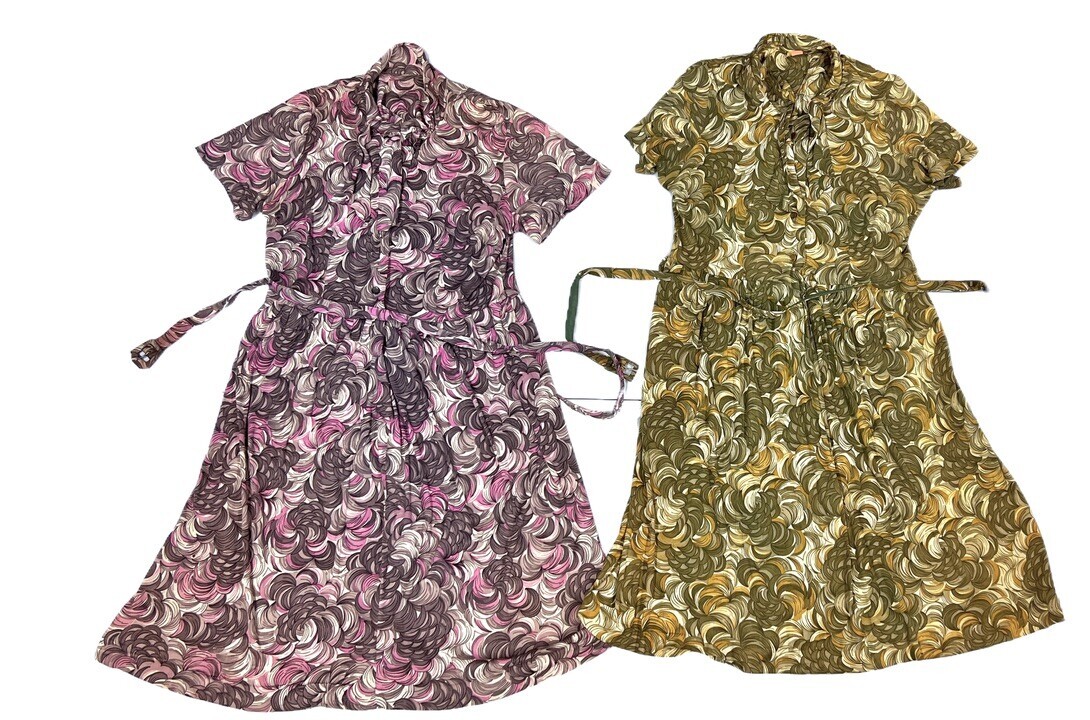 Need a ?Gramma dress? for a play or stage production? Better yet ? for twins? This listing includes two vintage 1960s house dresses in the same Swirl pattern (different colors, same size). Perfect for costume, theater, or reenactment use.