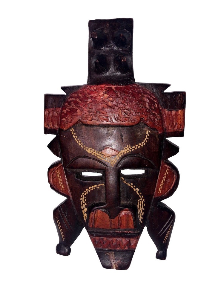 Hand-Carved African Tribal Wood Mask Kenya Red Brown Face Decor Free Standing