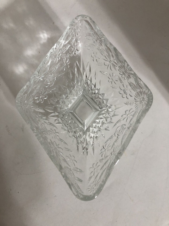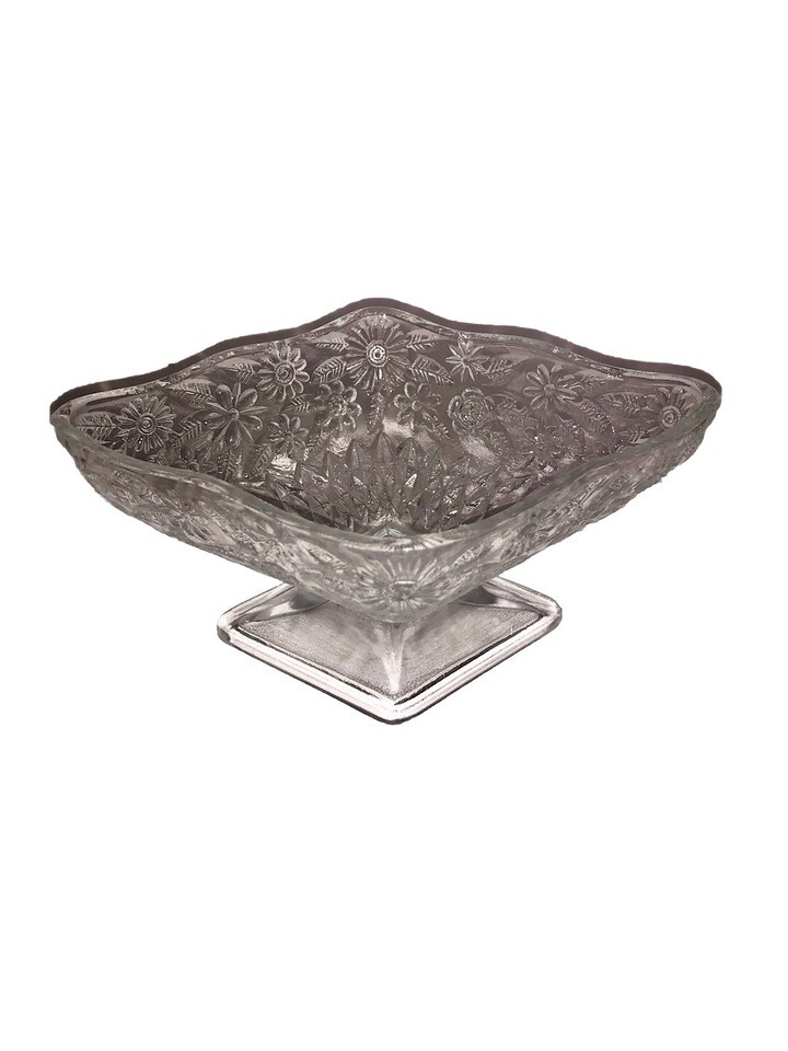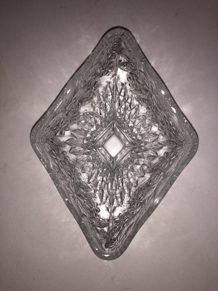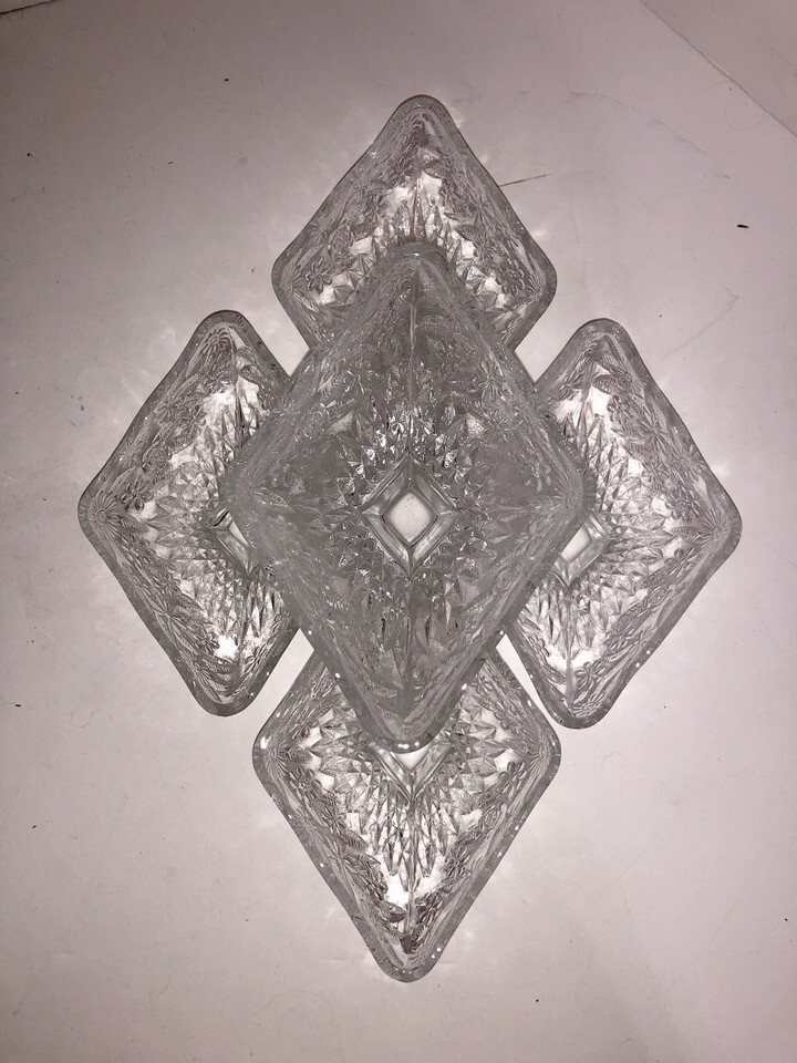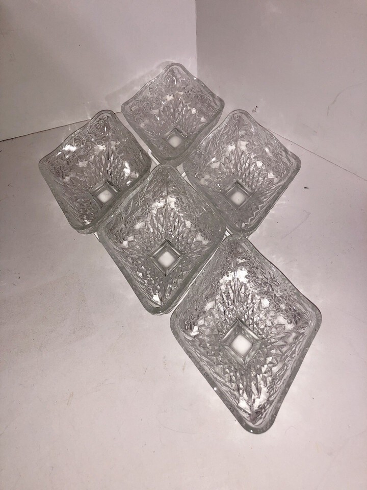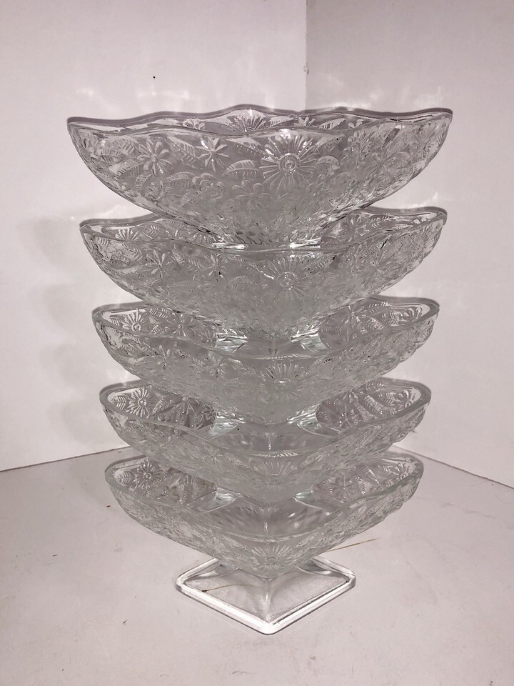 This product is a set of 5 vintage Indiana Glass clear pineapple and floral compote dishes, featuring a diamond shape with a glossy finish. Made of depression glass in the 1960s, these footed pedestal bowls are an original production style called chintz. With a flower theme and made in the United States, these candy dishes are a beautiful addition to any glassware collection.
