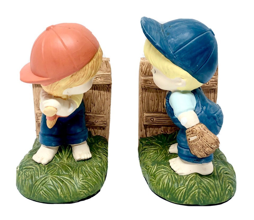 Vintage Enesco 1980s Bookends Ceramic Country Cousins Baseball Boy Girl Hats Bat Fence Yard Grass Glove