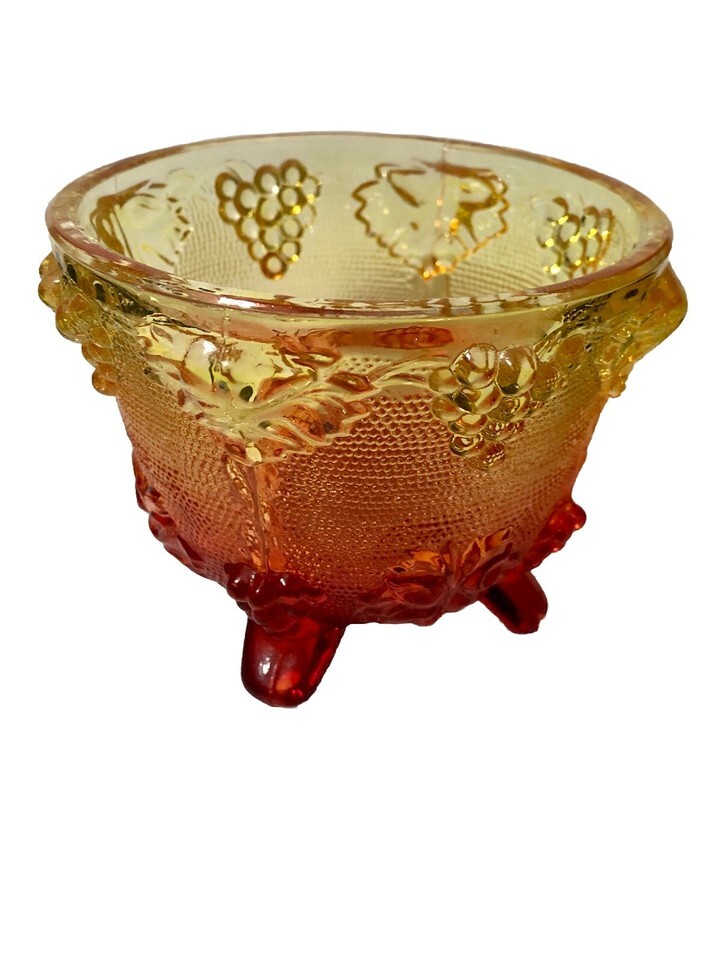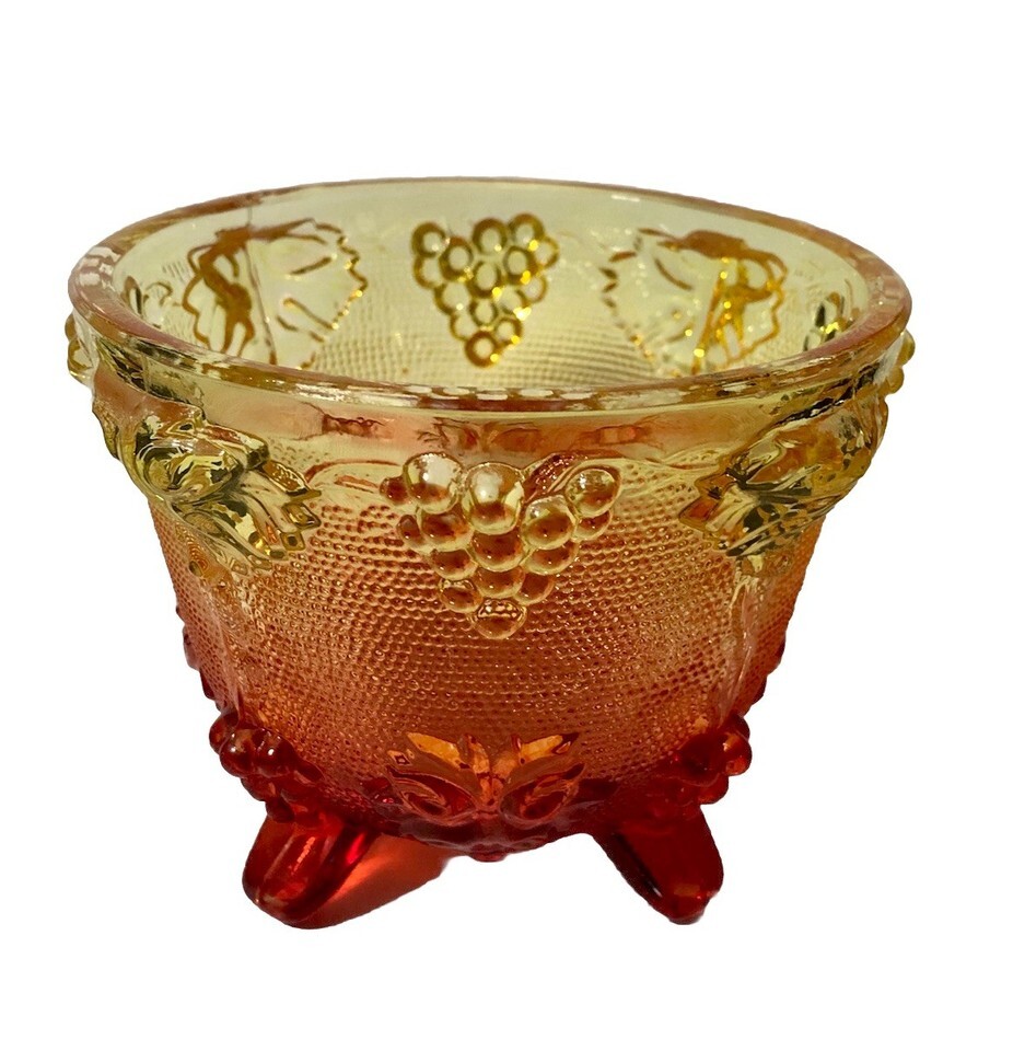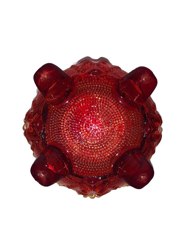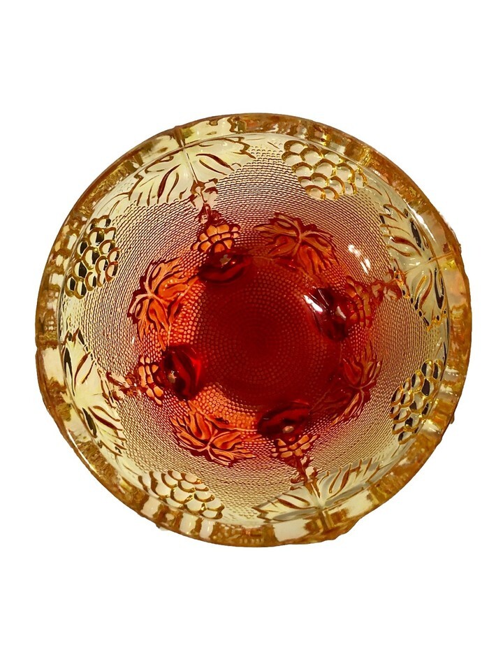 This vintage Jeanette Ruby Red Orange Glass Footed Candy Dish with a Grape Vine Design is a stunning piece of American-made art glass from the 1950s. The round bowl features an Amberina pattern in multicolor, showcasing intricate pressed glass details of grapes and vines. Standing at 3.5 inches tall and 4.25 inches in diameter, this decorative bowl by Jeannette is a unique and colorful addition to any collection of vintage glassware. Made in the United States using fused glass techniques, this piece exudes nostalgia and charm with its retro design. Bottom only.