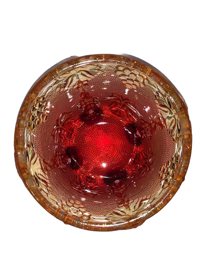 Vintage Jeanette Ruby Red Orange Glass Footed Candy Dish Grape & Vine Design