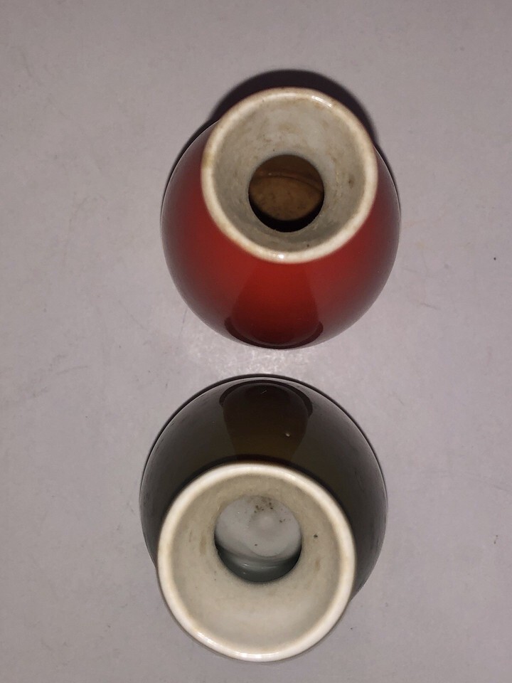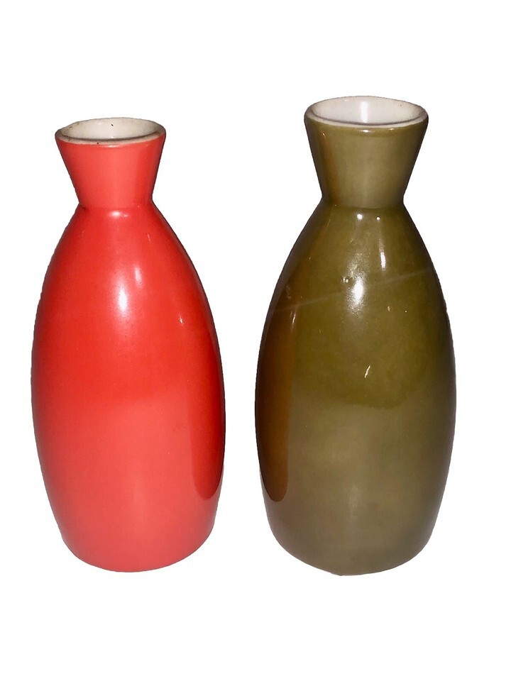 This product is a set of two vintage MCM Mid Century Modern green and orange porcelain bud vases from Japan. The solid-colored vases stand at 5 inches tall and feature a decorative Mid-Century Modern style. Made of porcelain using traditional pottery techniques in Japan, these original vases are perfect for adding a touch of retro charm to any space.