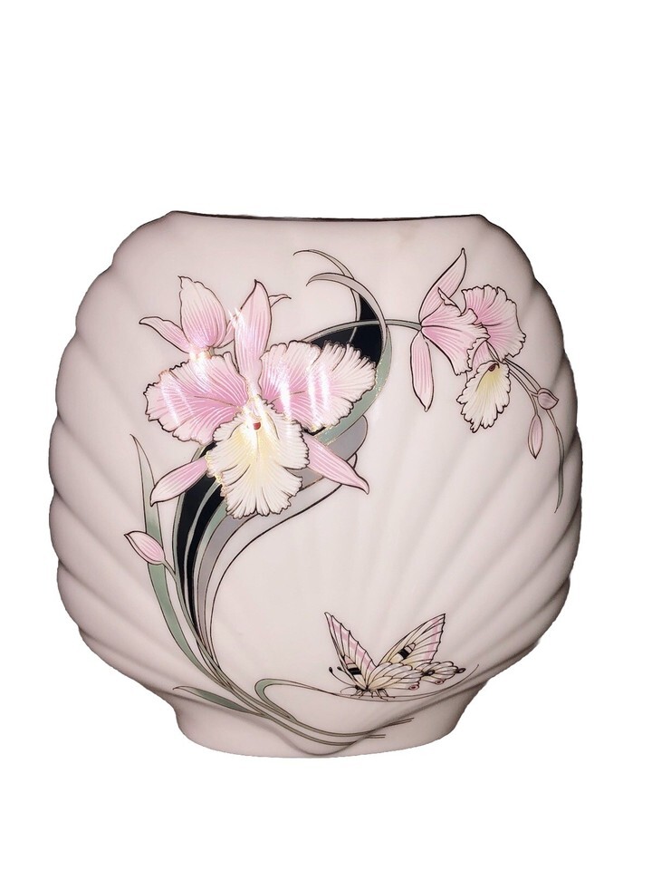 The VTG Fine China Japan Iris Flower Butterfly Wide Mouth Vase features intricate hand-painted designs and 24K gold trim, showcasing Japanese culture and craftsmanship. Made in Japan, this 6.5" tall vase is adorned with beautiful irises and butterflies, adding a touch of elegance and charm to any space. Perfect for collectors of Asian-inspired decor, this piece is a unique and visually striking addition to any home or collection.