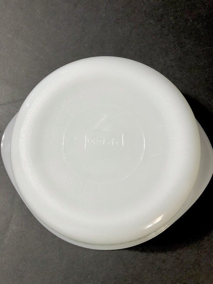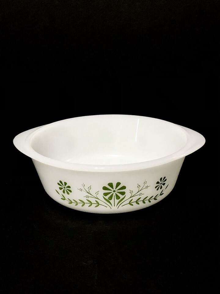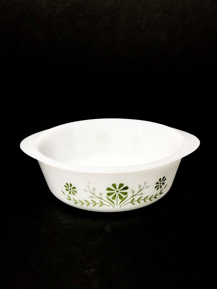 Vintage Glasbake Casserole Dish J2600 1 1/2 QT Green Daisy Milk Glass Round.