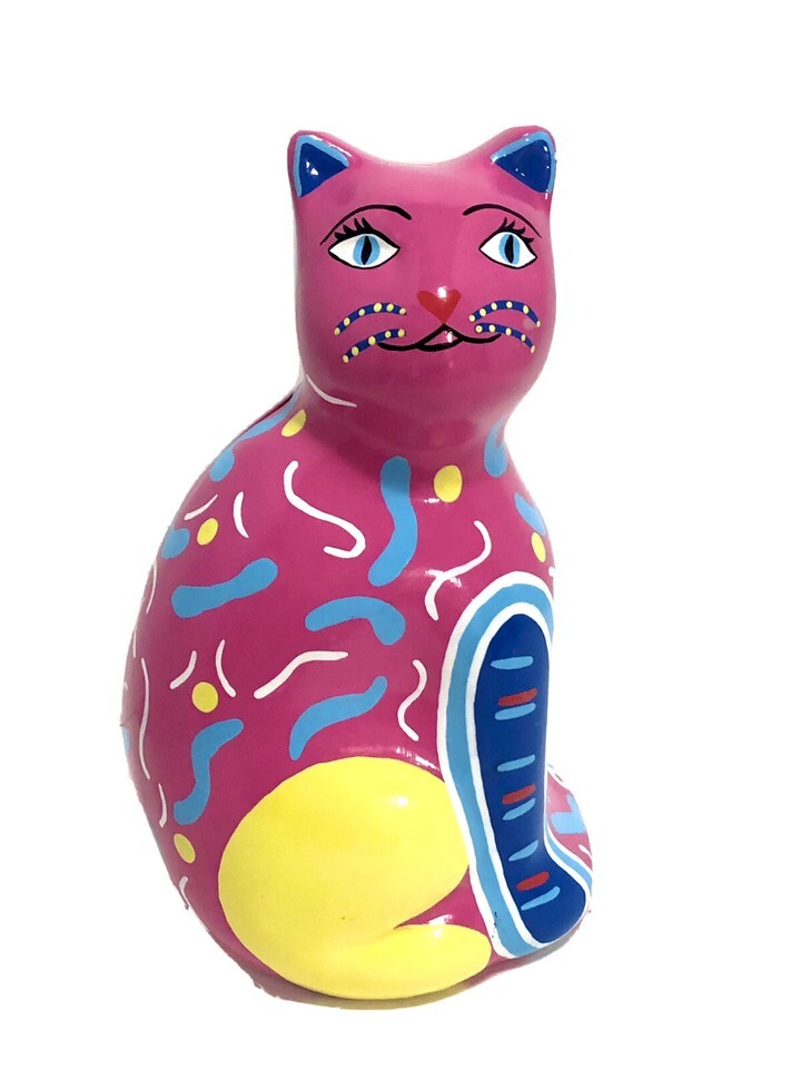 Made In Mexico Talavera CAT PIGGY BANK Hand Painted 9โ Tall Pink Pottery Vintage