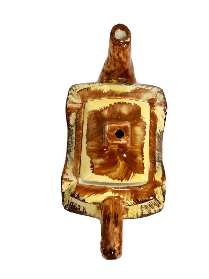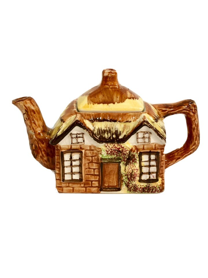 This is a vintage Price Kensington teapot from England, part of the Cottage Ware collection. It features a house design, is made of porcelain, and is handcrafted in an Arts Crafts/Mission Style. The teapot is decorated with a multicolor glaze finish and measures 8 inches in height and 5 inches in width, including the lid.