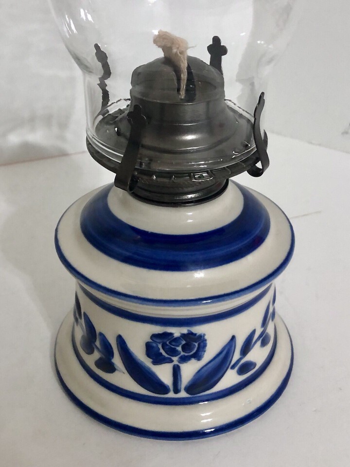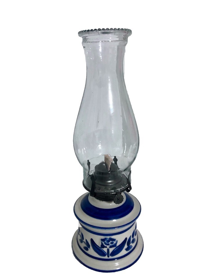 Vintage Lamplight Farms Blue And White Floral Ceramic Oil Lamp Globe White Wick