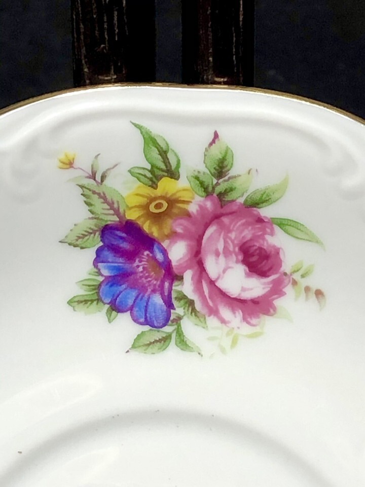 This is a vintage set of 4 saucers from the Royal Vienna Collection, made in Poland in the 1980s. The saucers feature a floral rose pattern in multicolor with a gold rim and embossed details. They are made of porcelain and are part of an original production in the art pottery style. Perfect for adding a touch of elegance to any dining or tea setting.