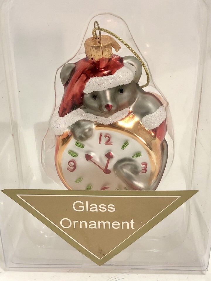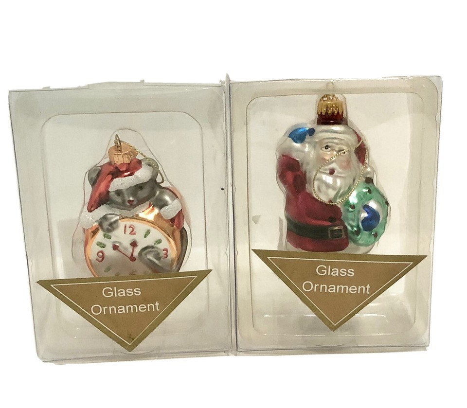 2 Glass Christmas Tree Ornaments Santa Wreath Mouse Clock 4” & 3.25” Holiday NEW