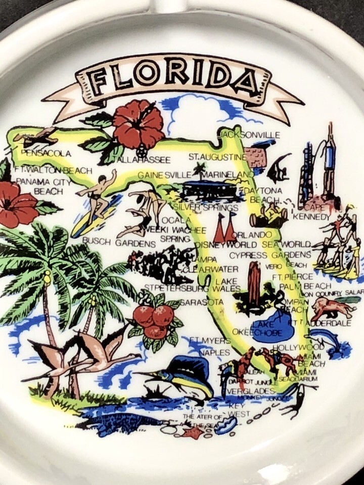 Vintage Florida State Map Cities Landmarks Ceramic Ashtray 4 3/4? diameter. Beach Dolphin Flowers. Kennedy Space Center, Bush Gardens, Disney World, Everglades, etc.