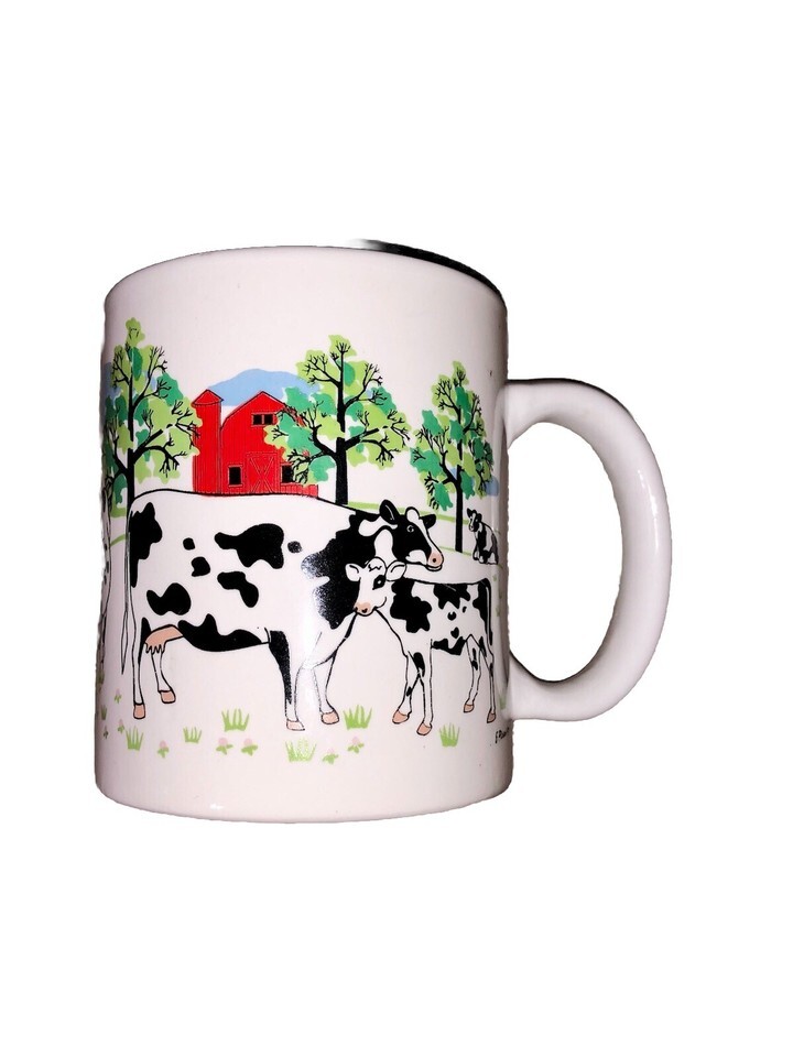 This vintage coffee mug/cup features a charming animal print pattern of cows and a barn, making it perfect for any occasion and a great addition to any collection. The multicolor design is decorated on normal glass and has a capacity of 11 ounces. This original and licensed reproduction from 1997 is made of ceramic porcelain and has a country style.