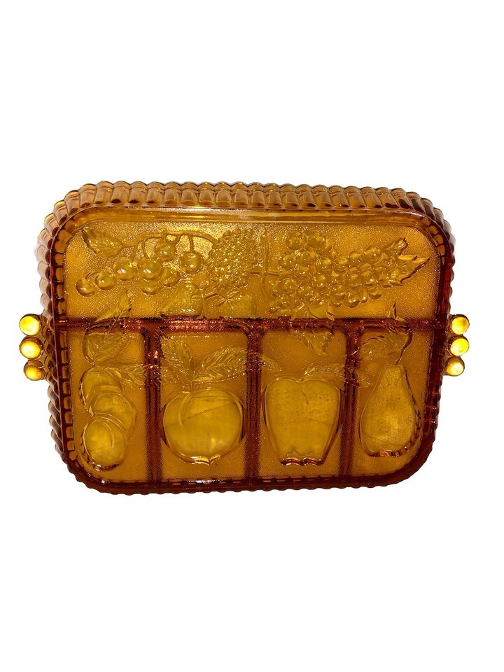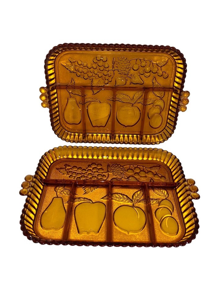 Indiana Glass Set Of 2 Vintage Amber Divided Relish Tray Platters Fruit Design