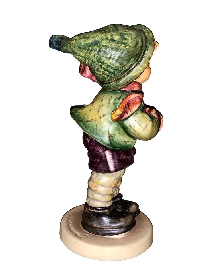 This vintage Hummel figurine depicts a young boy in winter clothing, with a cold expression on his face. The figurine is a special edition, numbered #421, #6 and was manufactured in 1981. It stands 5 inches tall and is made of porcelain with a matte finish.