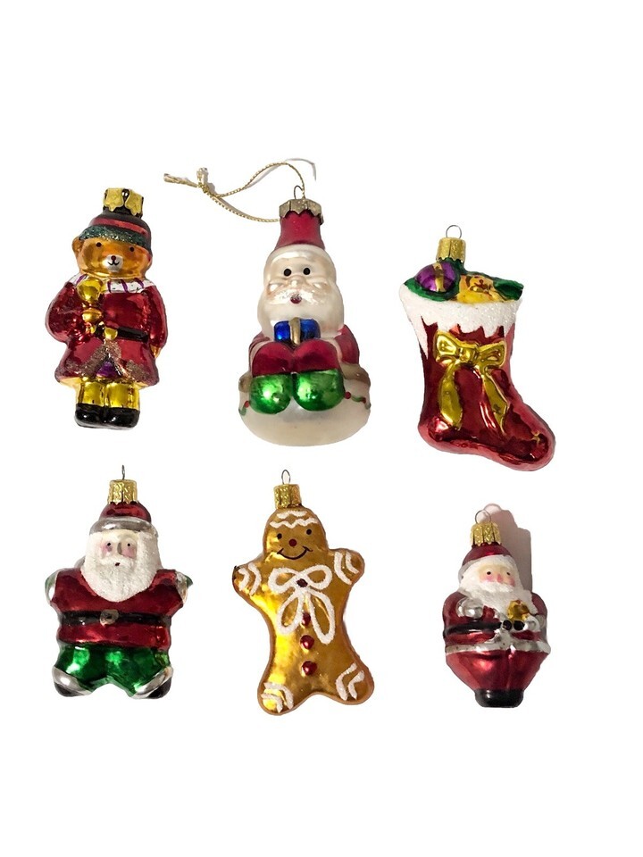 This product is a set of six vintage Mercury glass Christmas ornaments featuring a Santa Claus design, Christmas stocking, and gingerbread man. The ornaments stand at 3 inches tall and 1 inch wide, made of hand-blown glass with a multicolor glitter finish. Perfect for collectors or those looking to add a touch of nostalgia to their holiday decorations, these original ornaments come from a holiday-themed collection and are ideal for hanging on a Christmas tree.